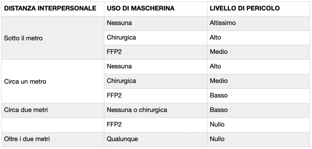 Facciamo un ragionamento di logica elementare: diamo per vero che il virus è aereo e si trasmette da persona a persona; e che c’è un rapporto (più o meno) matematico fra la distanza che passa fra persone, una delle quali infetta, e il rischio di contrarre il virus per chi gli sta vicino, nonché fra protezione via via più sicura e possibilità di evitare il contagio. In modo solo suggestivo questi fattori sono riepilogati nella tabella.