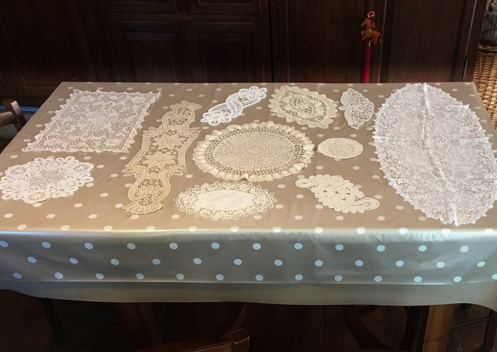 Questa magnifica serie di pizzi è stata comperata da mia moglie nei mercatini locali, generalmente per cifre che oscillano fra i 50 cent e un Euro. Lei li lava, li stira, e spesso li cuce amorevolmente su tovaglie per la tavola, come centrotavola o decorazioni laterali. Mia moglie sa farli, anche se non si cimenta più da diversi decenni, e ne conosce e apprezza il valore; commentiamo sovente, ammirando la bellezza di questi lavori, come dietro quei miserabili 50 centesimi ci siano stati, fra Ottocento e Novecento, fatiche, attenzioni e amori durati settimane e mesi, ché ricamare con perizia quei piccoli capolavori era arte (femminile) fatta di sapienza, esperienza, tempo a consumarsi gli occhi, la sera, dopo avere sbrigato le faccende domestiche; semmai per preparare il corredo di una figlia, corredo finito, generazioni dopo, in un solaio, in una cantina, sgomberato frettolosamente da nuovi inquilini e finito un tanto al chilo da rigattieri, e infine su bancarelle dove passano giovani distratte, o straniere, che non partecipano del medesimo flusso culturale che fanno ammirare a me, uomo dello scorso secolo, questi gioielli.