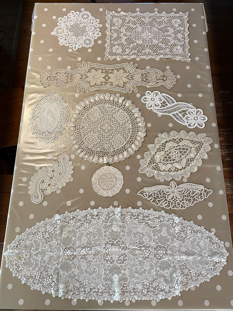 Questa magnifica serie di pizzi è stata comperata da mia moglie nei mercatini locali, generalmente per cifre che oscillano fra i 50 cent e un Euro. Lei li lava, li stira, e spesso li cuce amorevolmente su tovaglie per la tavola, come centrotavola o decorazioni laterali. Mia moglie sa farli, anche se non si cimenta più da diversi decenni, e ne conosce e apprezza il valore; commentiamo sovente, ammirando la bellezza di questi lavori, come dietro quei miserabili 50 centesimi ci siano stati, fra Ottocento e Novecento, fatiche, attenzioni e amori durati settimane e mesi, ché ricamare con perizia quei piccoli capolavori era arte (femminile) fatta di sapienza, esperienza, tempo a consumarsi gli occhi, la sera, dopo avere sbrigato le faccende domestiche; semmai per preparare il corredo di una figlia, corredo finito, generazioni dopo, in un solaio, in una cantina, sgomberato frettolosamente da nuovi inquilini e finito un tanto al chilo da rigattieri, e infine su bancarelle dove passano giovani distratte, o straniere, che non partecipano del medesimo flusso culturale che fanno ammirare a me, uomo dello scorso secolo, questi gioielli.