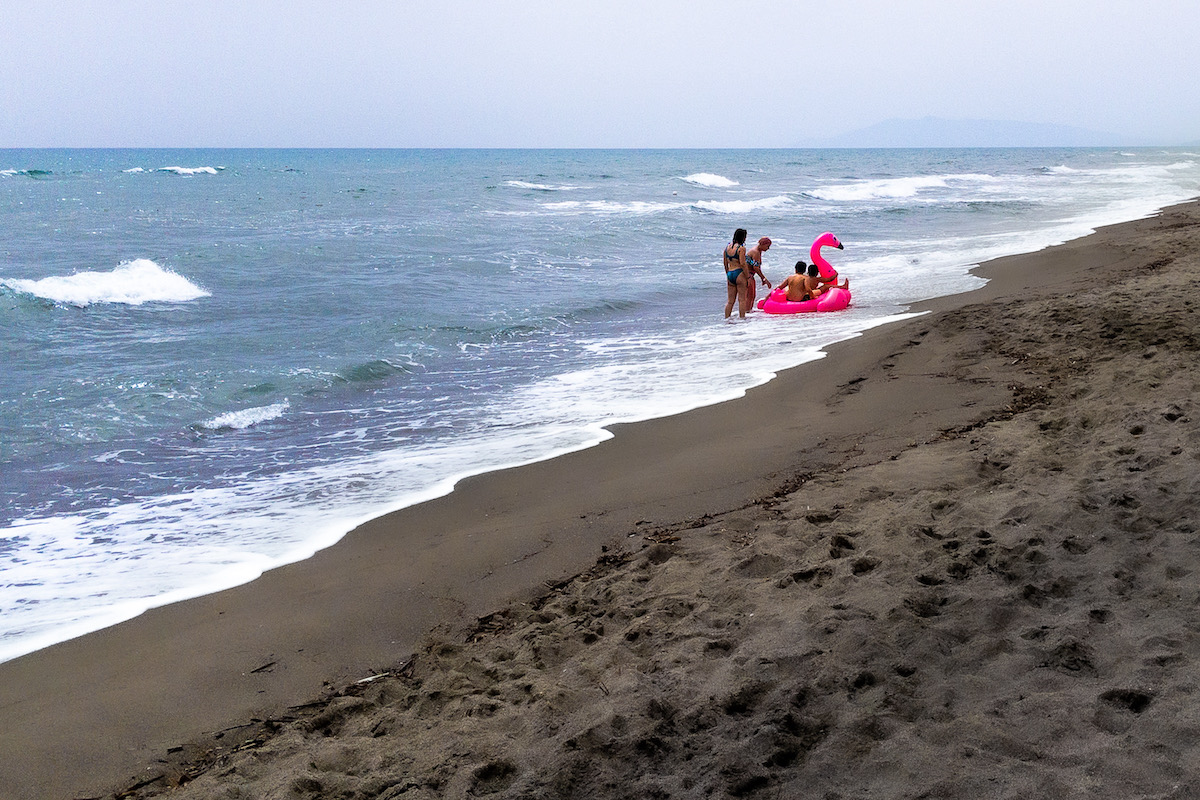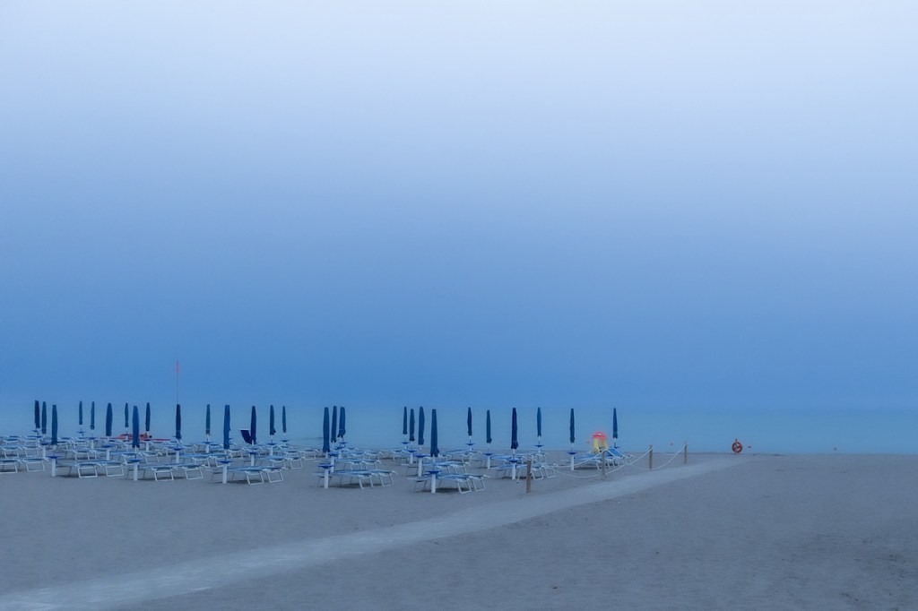 - le mascherine le portavano sì e no il 5%, anticipando l’imminente decreto liberatorio; ma va bene così, dai; anch’io, che sono un rigoroso, trovavo buffi, quasi alieni, i due, tre villeggianti che arrancavano in ciabatte sollevando sbuffi di sabbia, con la mascherina in mezzo a un popolo ignudo, impegnato a fare tuffi a bomba, bagni di sole e castelli di sabbia;