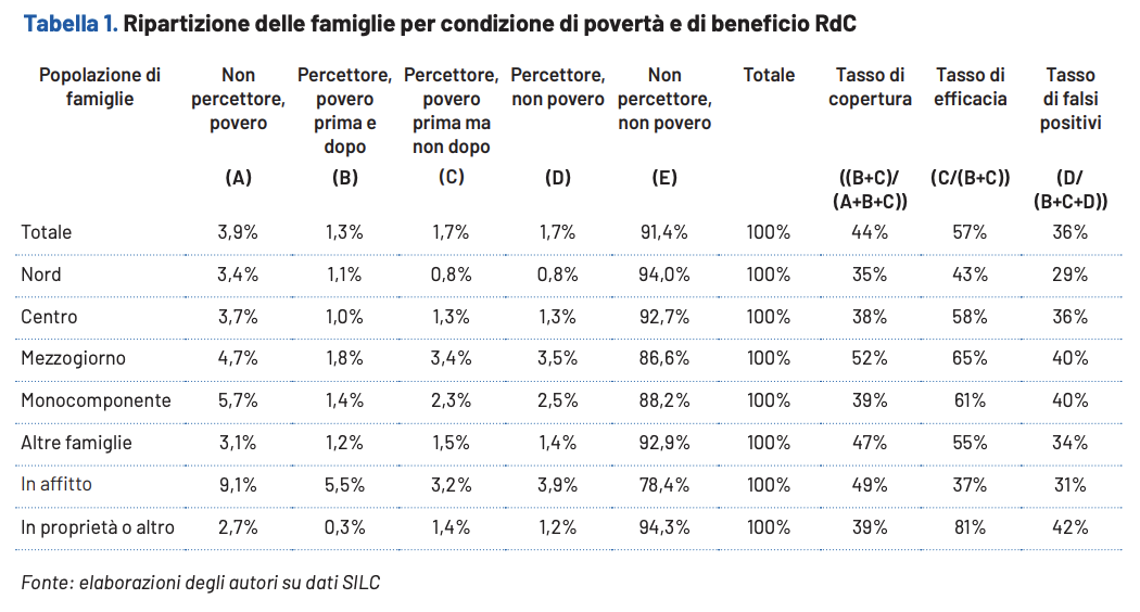 La prossima tabella è da leggere così: le famiglie italiane sono suddivise in cinque categorie: a) nucleo povero ma non percettore del RdC; b) nucleo povero che riceve il RdC, ma rimane povero nonostante il beneficio; c) nucleo povero che riceve il RdC e fuoriesce dalla povertà grazie al beneficio; d) nucleo percettore del RdC ma non povero; e) nucleo né povero né percettore RdC.