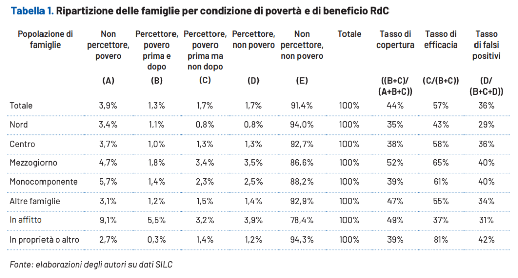 Quanti poveri hanno realmente beneficiato del RdC, considerando che in Italia (2019) ci sono circa 5,5 milioni di famiglie povere relative e 2 milioni di famiglie povere assolute (oltre 6 volte il numero di assegni distribuiti dal RdC)? Purtroppo non ci sono dati certi e accurati (p. 22), un segno del fatto che in Italia si varano politiche ma ci si guarda bene dal valutarle; Caritas ha fatto una simulazione, affidabile come lo può essere una simulazione per quanto ben fatta, realizzata su dati pre-pandemia (ovviamente il Covid 19 ha scombinato le cose). Adesso vi mostro i dati Caritas, davvero interessanti, avvertendovi che dovete armarvi di un po’ di pazienza.