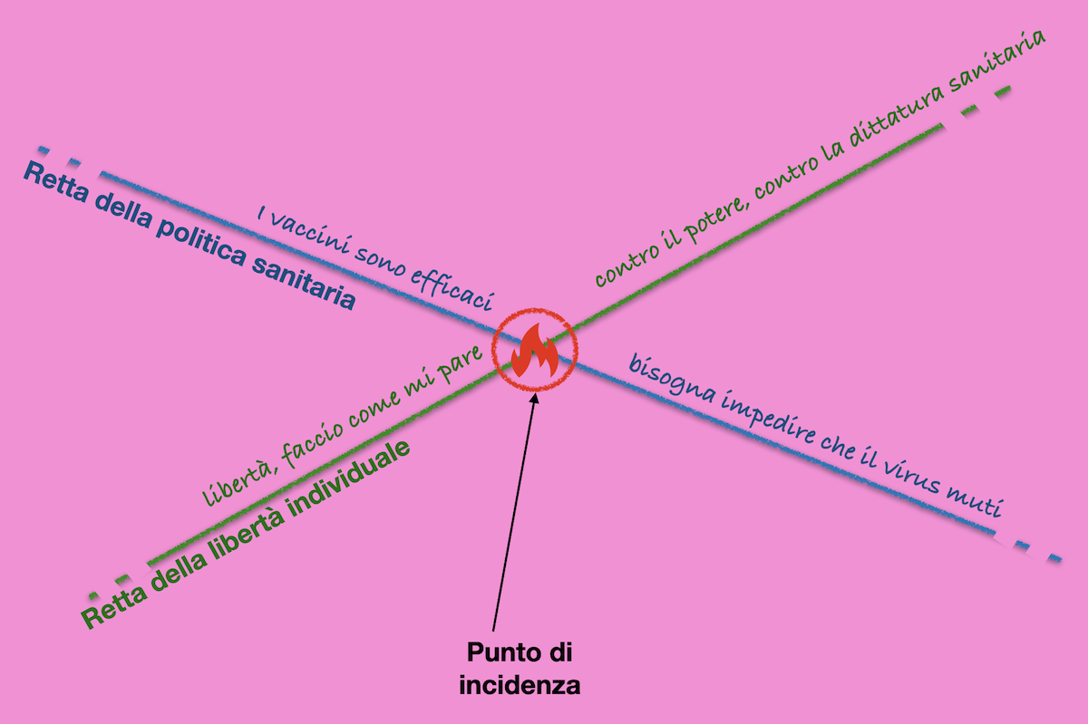 In particolare le righe conclusive del brano citato mi riconducono a una riflessione di un paio di settimane fa, quando sostenevo che è impossibile un dialogo con i no vax (ma vale per tutte le espressioni del populismo) per una ragione che veleggia fra linguistica e sociologia, vale a dire: i populisti, rispetto ai non populisti (e quindi: i no vax rispetto ai sì vax) propongono argomenti che viaggiano su un sistema segnico (semiotico) differente; per usare un termine sociologico: sono in una “provincia di significato” differente. I due gruppi parlano la stessa lingua, ma solo sul piano sintattico si incontrano (“Mi sa dire che ore sono?”; “Sì, sono le 10 e un quarto”; “Grazie”; “Prego”), non in quella dei significati profondi, dei valori espressi. In quell’articolo feci anche questo disegnino, per indicare discorsi su rette indipendenti e diverse che sì, hanno un punto di incidenza (vaccini, green pass) che diventa inesorabilmente conflittuale perché ciascuna fazione la argomenta entro le logiche della propria provincia di significato (restando sulla propria retta, per restare all’immagine) senza poter capire e cogliere il senso argomentativo prodotto dalla fazione avversa.