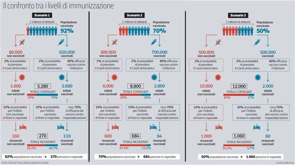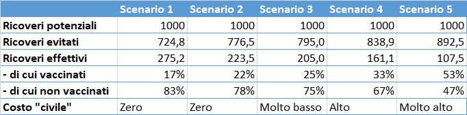 Usando questi valori, e il dato già fissato del 94% per l’efficacia del vaccino nel prevenire l’ospedalizzazione, si ottiene finalmente l’esito atteso in ciascuno scenario: