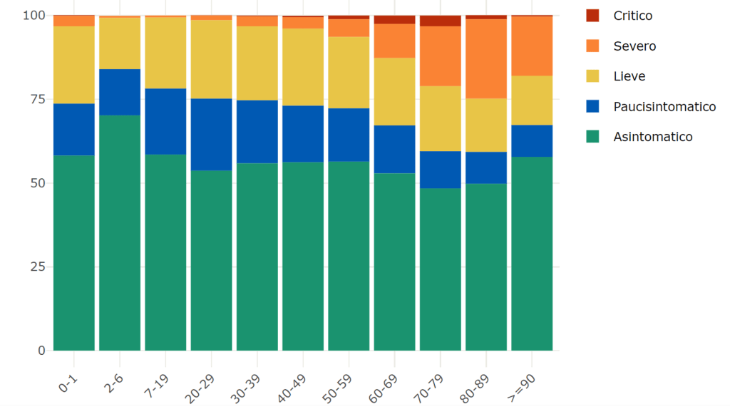 Premetto subito che i dati che occorrono vanno un po’ cercati e rielaborati, per cui non prendete quanto segue come oro colato. Per le differenze tra gli effetti della malattia in funzione dell’età, è piuttosto chiaro il grafico qui sotto, prelevato dall’infografica Dati della Sorveglianza integrata COVID-19 in Italia che viene periodicamente aggiornata dall’ISS. I ricoveri corrispondono ai livelli ‘Severo’ e ‘Critico’.