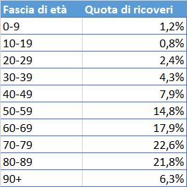 Utilizzando i dati dettagliati presenti sul sito dell’INFN (io ho usato quelli aggiornati fino al 2/8/2021), si può ricostruire la tabella qui sotto, in cui vediamo che il 50,7% dei ricoveri è relativo alle persone dai 70 anni in su, che costituiscono solo il 17,4% della popolazione.