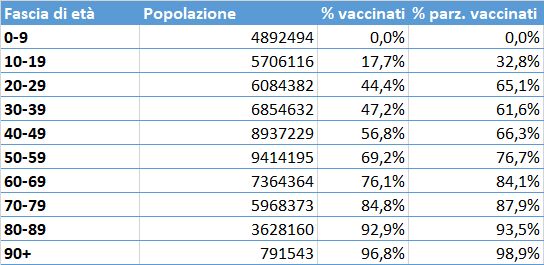 Anche i dati sulle vaccinazioni sono fortemente differenziati tra le diverse fasce di età, come si vede dalla tabella qui sotto: