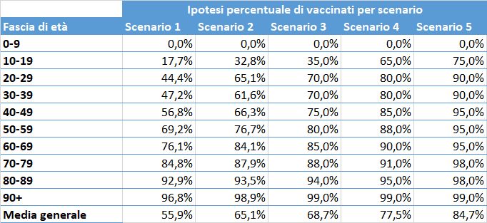 A questo punto possiamo definire degli scenari da valutare per rispondere alla domanda Quali benefici effettivi si possono ottenere “forzando” gli incerti e i giovanissimi a vaccinarsi?. A ogni scenario faremo corrispondere un possibile livello di copertura vaccinale, e, un po’ diversamente dai modelli usati da Giordano, valuteremo i benefici in termini della riduzione attesa del numero di ricoveri rispetto a quelli che si avrebbero se i vaccini non esistessero. A fronte dei benefici, dovremo però chiederci anche quali possano essere i costi da sostenere, e non parlo dei costi connessi alla somministrazione del vaccino, bensì dei costi immateriali derivanti dai livelli progressivamente crescenti di “forzatura” esercitata sui cittadini riluttanti o indecisi: è certamente complicato darne una valutazione (e infatti nel seguito parlerò, qualitativamente, di costi ‘bassi’ o ‘alti’), ma includono sia la compressione della libertà personale di chi decide (a tutt’oggi legittimamente) di non vaccinarsi, sia la divisione dei nostri concittadini, ai fini di moltissime attività quotidiane, in “vaccinati” e “non vaccinati”, con le implicazioni di polarizzazione e di reciproca diffidenza che sono a mio avviso già evidenti, le speculazioni politiche, eccetera. Naturalmente, mentre i dati epidemiologici sono, entro certi limiti, oggettivi, la mia preoccupazione per la serietà di queste implicazioni non ha niente di oggettivamente misurabile. Semplicemente, a mio avviso, chiunque debba prendere una decisione deve essere consapevole di questo fattore e deve dargli un peso, e in base al peso che gli assegna cercare il punto di equilibrio con le ragioni dell’ “asse sanitario”.