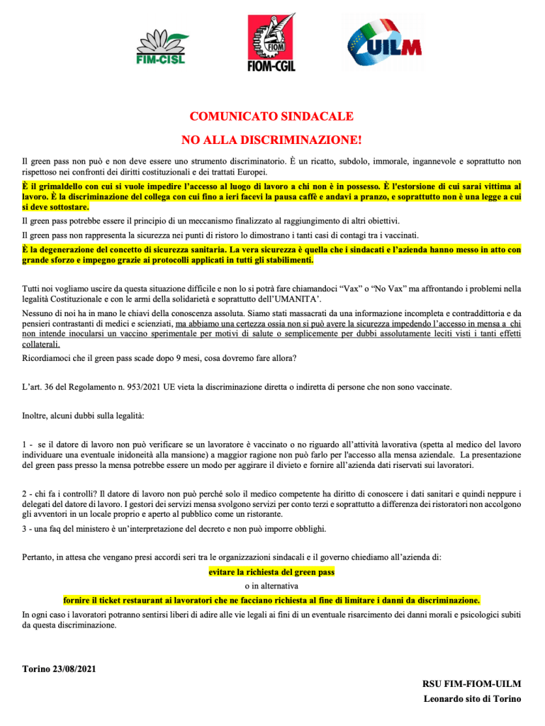Riproduco qui – a titolo di esempio – il comunicato Cgil-Cisl-Uil diffuso alla Leonardo di Torino (clic per ingrandire), che non credo sia stato smentito dai segretari generali. Per inciso, il richiamo – in quel delirio – all’articolo 36 del Regolamento n. 953/2021 UE, è un falso, perché tale articolo fa riferimento alle persone che non sono vaccinate per motivi medici o perché non hanno ancora avuto l’opportunità di essere vaccinate, questioni ampiamente superate dalla normativa sul green pass. Errore degli estensori del comunicato? Malafede? Non saprei cosa sia peggio.