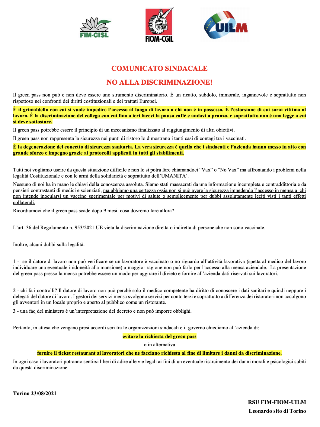 Riproduco qui – a titolo di esempio – il comunicato Cgil-Cisl-Uil diffuso alla Leonardo di Torino (clic per ingrandire), che non credo sia stato smentito dai segretari generali. Per inciso, il richiamo – in quel delirio – all’articolo 36 del Regolamento n. 953/2021 UE, è un falso, perché tale articolo fa riferimento alle persone che non sono vaccinate per motivi medici o perché non hanno ancora avuto l’opportunità di essere vaccinate, questioni ampiamente superate dalla normativa sul green pass. Errore degli estensori del comunicato? Malafede? Non saprei cosa sia peggio.