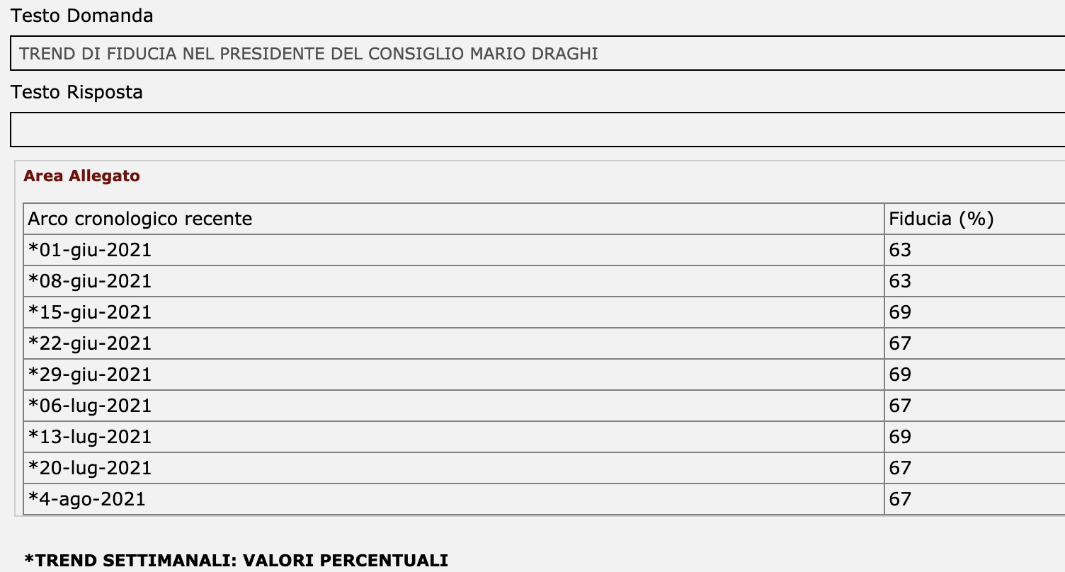 Concludo subito segnalando perché questi sondaggi, usualmente fallaci, lo sono particolarmente in questo periodo; perché non possono tenere conto dell’effetto Draghi. Un altro sondaggio del simpatico Piepoli (per la Repubblica) ci informa che il 67% degli intervistati ha fiducia in Draghi (nelle settimane il dato ha oscillato da 63 a 69%).