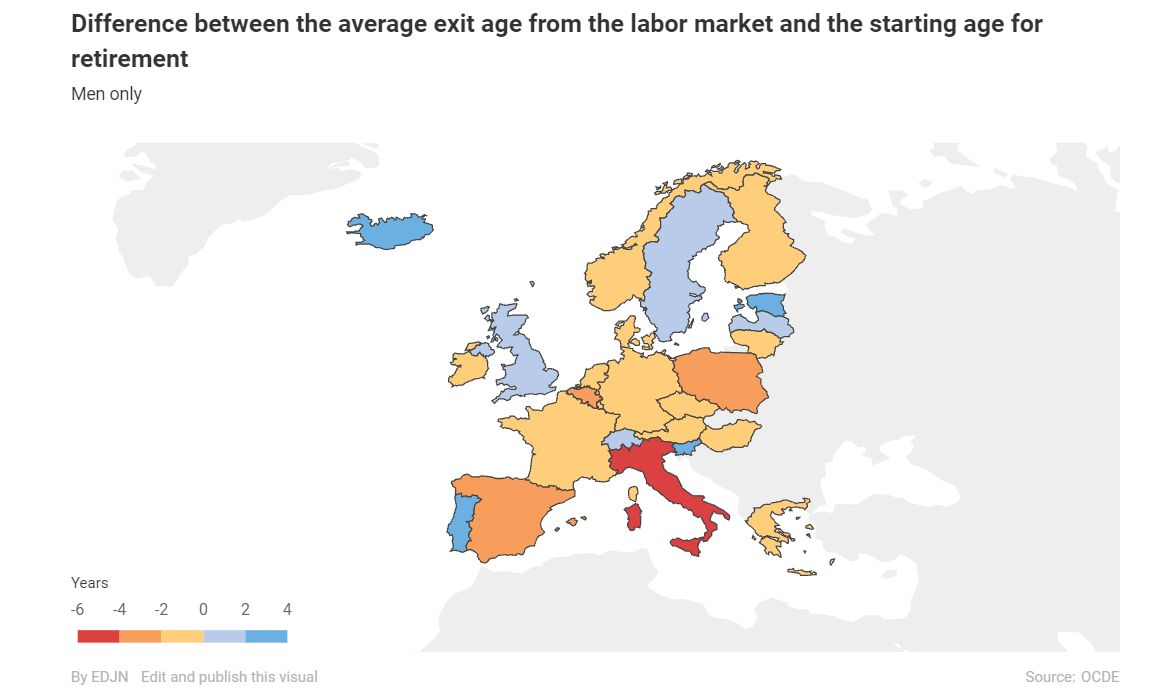Questo limite di 67 anni è tra i più alti in Europa, dato che secondo Wikipedia solo Grecia, Islanda e Norvegia lo eguagliano. Dobbiamo quindi ritenere che la legge italiana sia effettivamente troppo rigida? Piano: sappiamo come funzionano le cose nel nostro paese. Se infatti andiamo a vedere l’età media a cui effettivamente gli italiani e gli altri europei vanno in pensione, la classifica cambia parecchio: qui sotto, riporto una mappa che evidenzia quanto la media dell’età pensionabile effettiva nei diversi paesi si distacchi da quella prevista dalla legge.