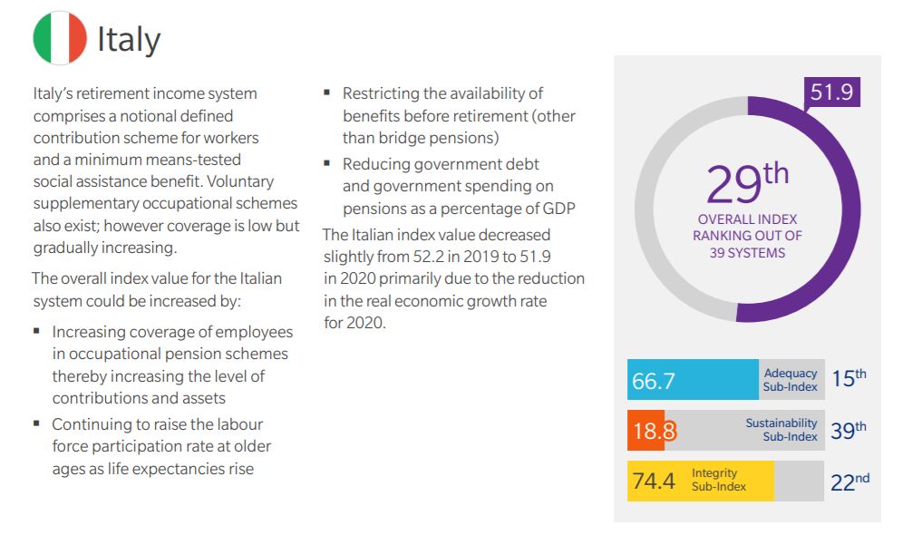 Chi avesse dei residui dubbi sulla precarietà della nostra Previdenza può leggere l’interessante rapporto pubblicato da Mercer e CFA Institute dal titolo Global Pension Index 2020, nel quale i sistemi pensionistici di 39 paesi sono valutati in tre diversi ambiti: adeguatezza (del valore delle pensioni rispetto al precedente reddito da lavoro), sostenibilità, integrità (ossia affidabilità dei soggetti e delle norme coinvolti nelle pensioni pubbliche e private).