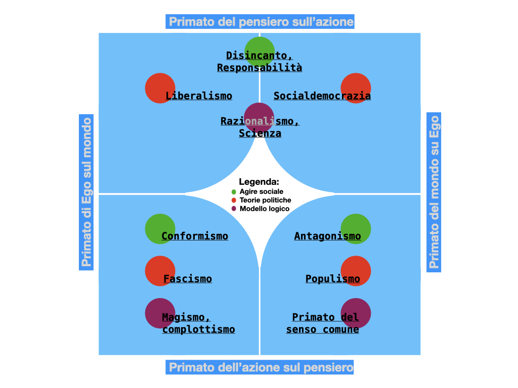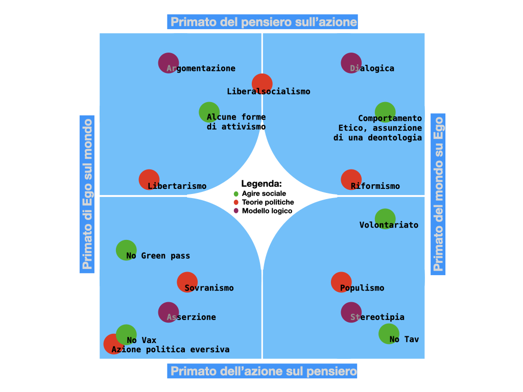 Il fatto che sia uno schema (per ciò stesso rigido) esemplificativo (e quindi ipersemplificato) non deve distrarre il lettore. La figura va compresa nei suoi intenti simbolici e qui, come nella prossima, la definizione degli elementi disposti in figura, e la loro esatta collocazione, non deve essere oggetto di osservazioni marginali che esulino dal valore impressionistico di questo esercizio. Direi che al momento – dal mio punto di vista – questa mappa concettuale è piuttosto soddisfacente per identificare grosso modo quattro tipi sociali, politici, umani. La prossima figura prova (con maggiori margini di incertezza) a inserire in figura comportamenti e atteggiamenti più specifici: