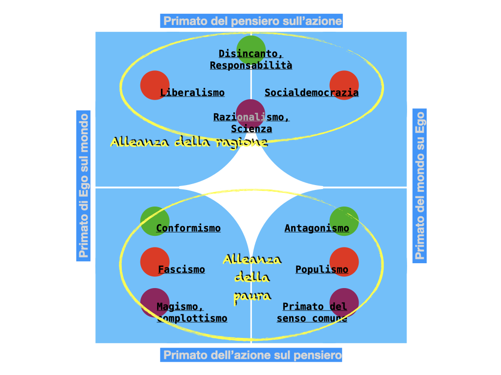 Se siamo comunque sulla strada buona, queste mappe devono aiutarci fornendoci una chiave di lettura di quanto sta accadendo. Per esempio la commistione fra pensiero di destra e antivaccinismo, che sta scuotendo un po’ tutta Europa in queste settimane, Italia inclusa, è ben rappresentata dal quadrante in basso a sinistra, quella che coniuga forme logiche assertive alla paranoia complottista, all’idea infantile del primato di Ego, alla fondamentale opposizione eversiva contro le istituzioni: tutte componenti tipiche del fascismo e anche dell’antivaccinismo più fanatico ed esaltato. Attenzione: non sto dicendo che gli antivaccinisti siano fascisti, o viceversa. L’idea che sto perorando è che la personalità individuale, e le conseguenti componenti sociali, di massa, sono composite, frammentate, complesse; ci sono i fascisti – restando in questo quadrante – e ci sono gli antivaccinisti, che non necessariamente coincidono. Ma – questo penso – l’organizzazione cognitivo-culturale, l’assetto dei valori e dei linguaggi, la genesi degli schemi mentali di costoro (fascisti e antivaccinisti) hanno delle somiglianze, dei punti in comune. Ci possono benissimo essere fascisti vaccinati, e antivaccinisti socialisti, perché la questione riguarda la sovrapposizione di un certo numero di proprietà che, tutte assieme, conducono prevalentemente entro una tipologia o un’altra.