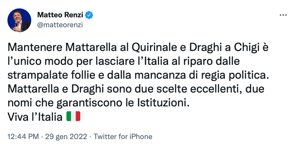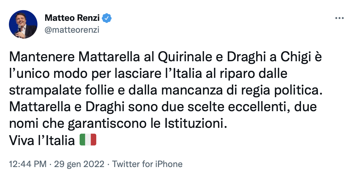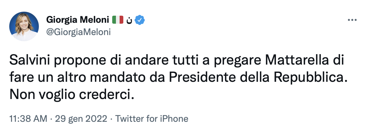 Mattarella 10. Povero diavolo; più chiaramente di così non poteva dirlo, che lui proprio non voleva fare il bis, che non era il caso, che era istituzionalmente scorretto; aveva lanciato Draghi in pole position, aveva mostrato gli scatoloni del trasloco e la sua nuova dimora, proprio per dire “Vedete? Sto andando via!”. Adesso la masnada di falliti della politica che pascola al Parlamento lo implora di tornare perché non sa neppure trovarsi il naso quando ha il raffreddore. Gli faranno fare la fine di Napolitano, prima supplicato poi criticato. Oppure, forse… fra un anno…