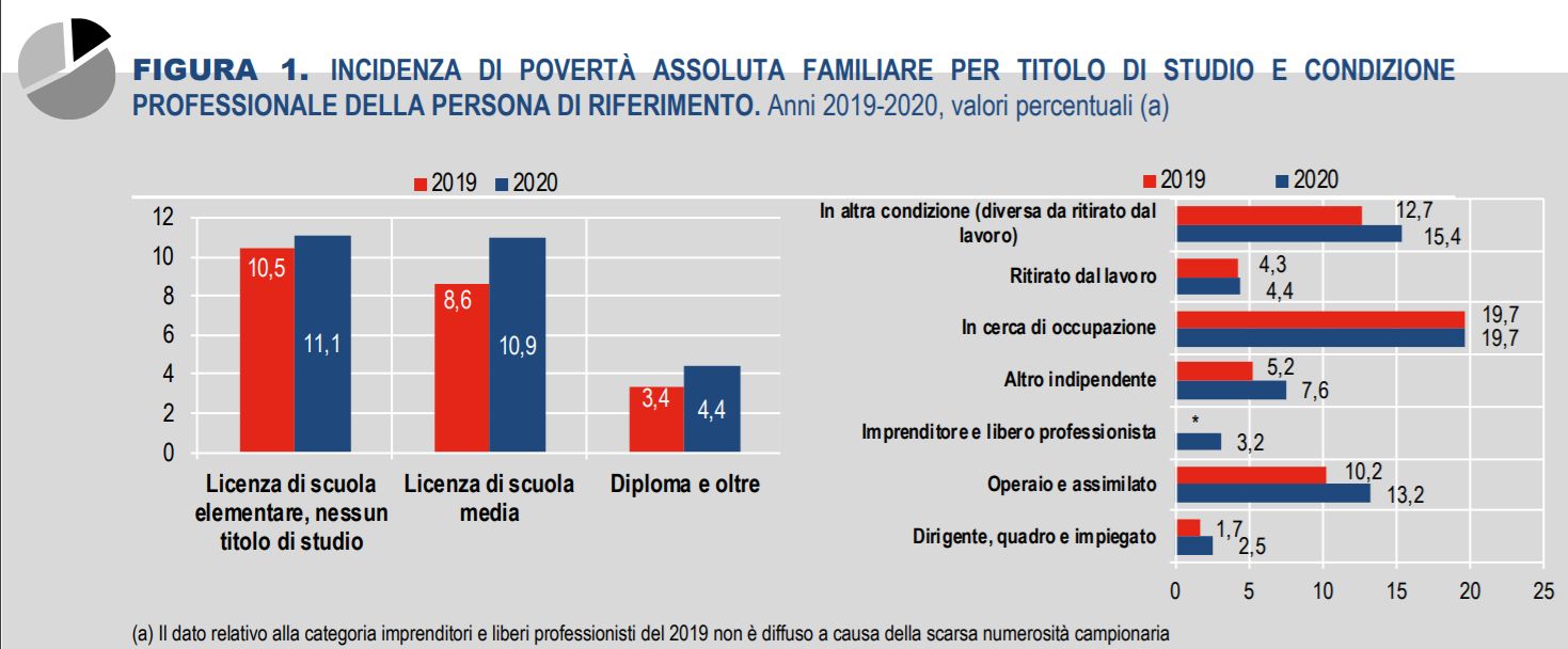 Anche dal punto di vista del tipo di attività svolta, come si vede nel grafico qui sotto a destra, solo i pensionati (e, in un certo senso ovviamente, i disoccupati) non hanno visto crescere il loro rischio di povertà. Ancora una volta, insomma, occorre sottolineare che è a favore dei lavoratori, e in particolare dei lavoratori giovani, inclusi gli autonomi (che nel 2020 hanno subito il maggior incremento percentuale di poveri), che è indispensabile intervenire per riequilibrare almeno parzialmente la condizione patologica per cui in Italia le classi che lavorano sono anche quelle che vivono peggio.