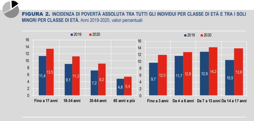 Infine, vale la pena di aggiungere che i dati Istat sulla povertà assoluta nel 2020 a cui facevo riferimento confermano, nello scenario di peggioramento economico complessivo, alcuni dati di cui qui su Hic Rhodus abbiamo spesso discusso, ad esempio a proposito delle disuguaglianze intergenerazionali. I giovani sino ai 34 anni di età sono i più colpiti dalla povertà e solo gli anziani hanno “limitato i danni” degli effetti economici della pandemia e dei lockdown del 2020.