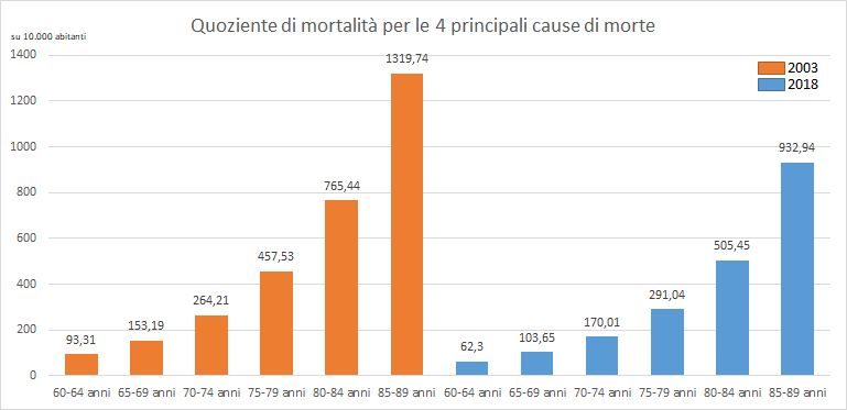 Dieci anni fa, probabilmente, vi avrei risposto diversamente, ma oggi credo proprio che la colpa della mia dipartita sarà di una malattia infettiva. Con ogni probabilità, non del Covid-19, neanche in qualcuna delle sue, inevitabili, future varianti; molto più verosimilmente, sarà qualche batterio farmacoresistente o un virus non ancora conosciuto a farmi fuori. Da un lato, si tratta in realtà di una buona notizia: la tanto bistrattata sanità italiana (ripeto qui un mantra che vorrei fosse assimilato da tutti: il maggior patrimonio di noi cittadini è la sanità pubblica, e il peggior nemico dei cittadini è chi vuole smantellarla), silenziosamente, sta combattendo con efficacia le principali cause di morte che colpiscono gli italiani, e i risultati non sono disprezzabili, come si può vedere dai dati Istat nella sezione Salute e sanità. Per la mia fascia di età e il mio sesso, tra il 2003 e il 2018 il quoziente di mortalità per tutte le cause censite è diminuito da 113,11 per 10.000 abitanti a 78,68 sempre per 10.000 abitanti, un calo del 30% in relativamente pochi anni. Questo è dovuto in particolare al fatto che le malattie che causano più morti sono oggi meno pericolose, come si vede nel grafico qui sotto, che riporta appunto il quoziente di mortalità per il sesso maschile nelle diverse fasce di età che mi aspetto di poter attraversare prima di abbandonare questa valle di lacrime, sommando i contributi di tumori, malattie del sistema circolatorio, malattie del sistema respiratorio e malattie del sistema nervoso. Come si vede, la riduzione è consistente e si estende anche all’età avanzata; un ragionamento analogo si potrebbe fare per il sesso femminile, mutatis mutandis.