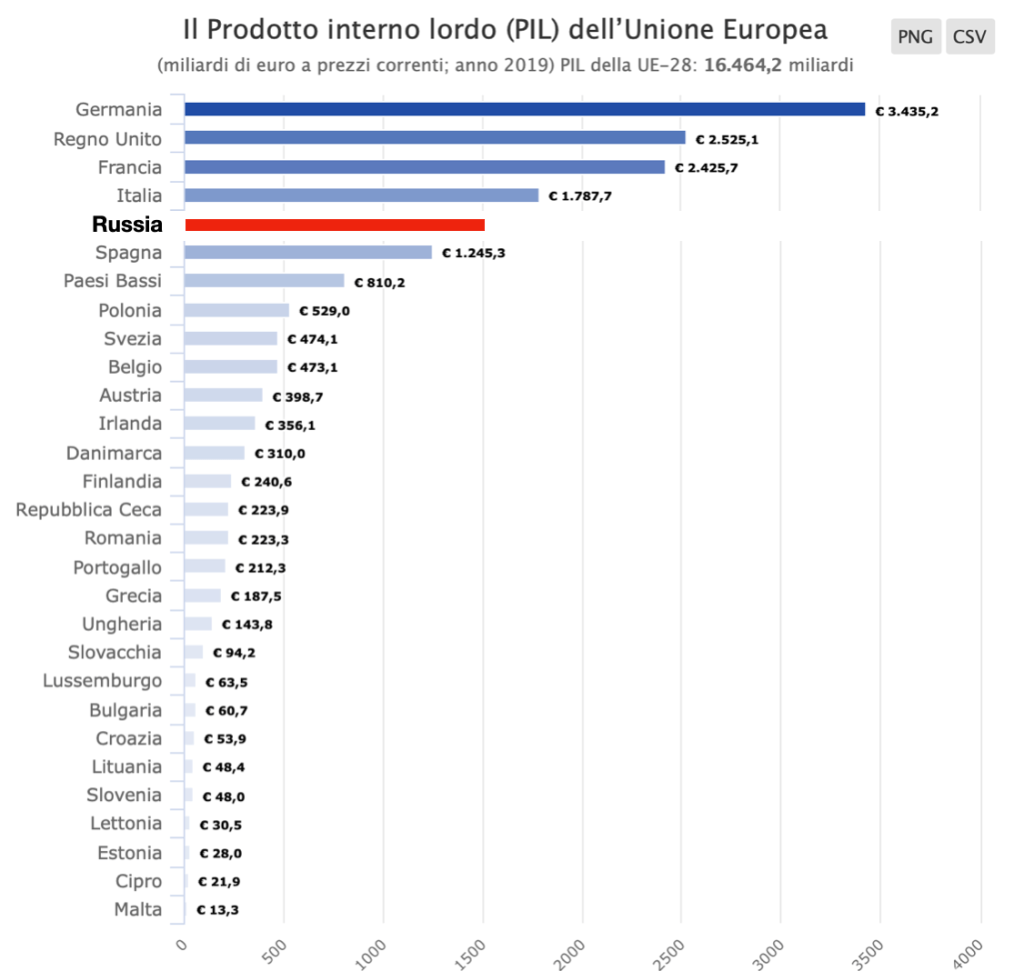 Putin minaccia per ottenere un vantaggio diplomatico (e pare che in queste ore si stia facendo qualche passo avanti), perché una guerra sarebbe disastrosa per tutti, ma principalmente per la Russia. Come si vede dal grafico, il PIL russo è inferiore anche a quello italiano, e l’intera Europa (UE) ha un PIL oltre 10 volte quello russo.