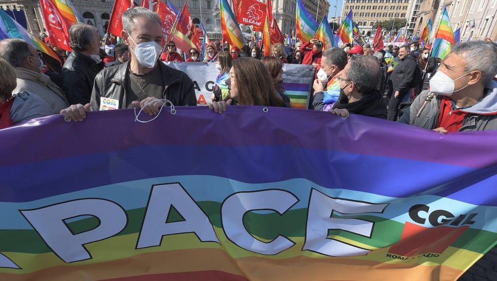A Mosca chi protesta va in galera, noi sfoderiamo le bandiere del Pci e sfidiamo l’Ambasciata russa a retwittarci, come “Il Fatto”. Molti cartelli “contro la Nato”, contro “la guerra”, contro “le armi”. Niente sulla Russia (banale). Non siamo didascalici. Se c’è l’America va bene, ma qui va in crash il sistema, si inceppa il format, l’algoritmo italiano si blocca. Meglio prendersela con la guerra e basta. Siamo “neutrali ma attivi”, la variante geopolitica del “dimagrire dormendo”. La situazione è drammatica, tragica, intensamente sofferta da tutti. A gruppetti sul pratone, avvolti nel drappo della pace, i manifestanti parlano fitto di scatti stipendiali e congedi: “Ma tu l’hai maturati i requisiti?” “ma io sto in aspettativa”. Parte un’arringa sulla pace, poi un affondo sulla brutalità di tutte le guerre della storia, dagli Assiri a Putin. Poi un appello: “disarmo climatico subito!”. Pensavamo il problema fossero le bombe, ma è la guerra che distrae dal global warming. Poi a cascata un fiume torrenziale di rivendicazioni a braccio: la Siria, la Palestina, l’Iraq, la disoccupazione, quota 100, il femminicidio, tutte le discriminazioni di genere (“le vere vittime della guerra sono le donne”).