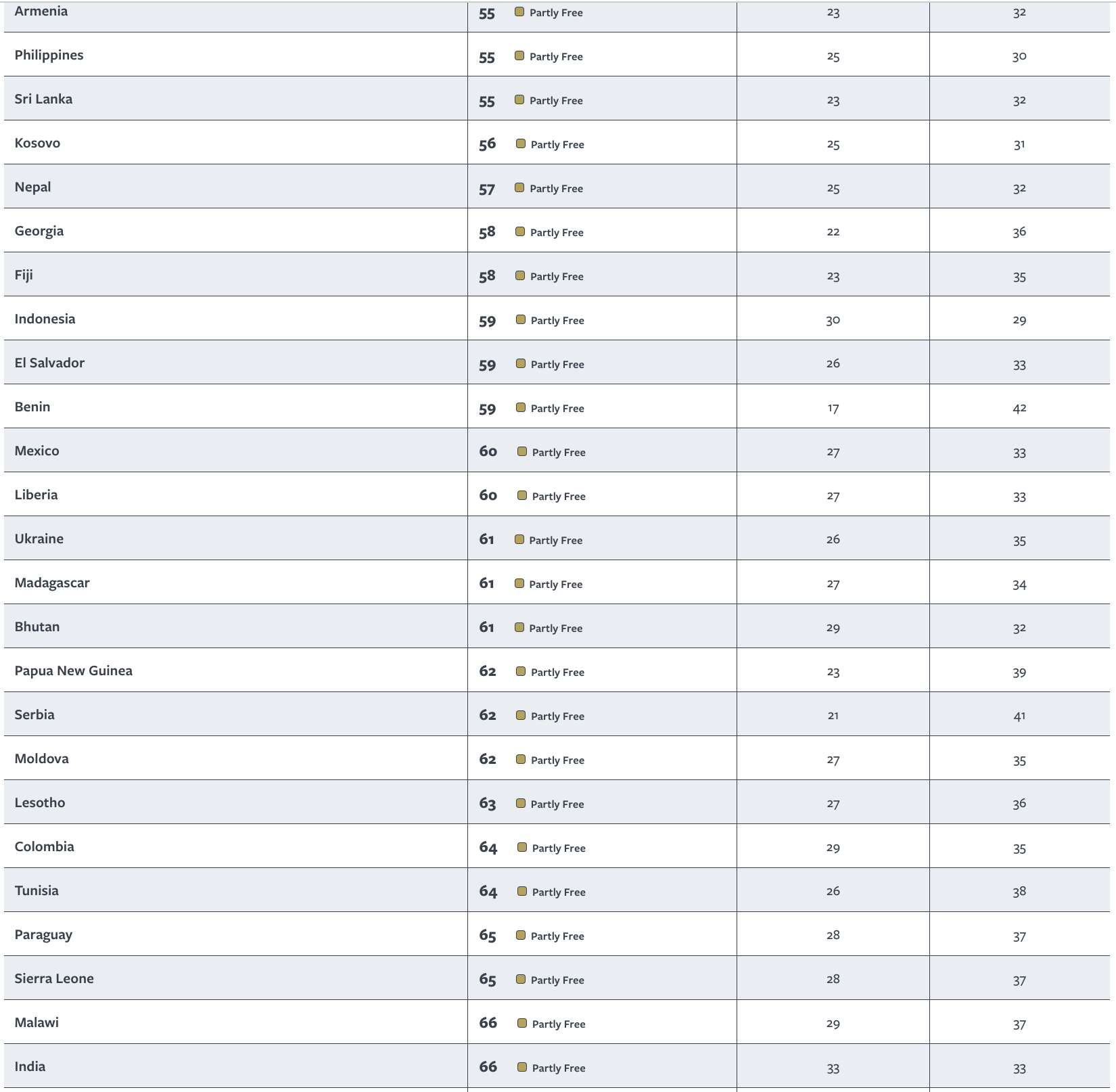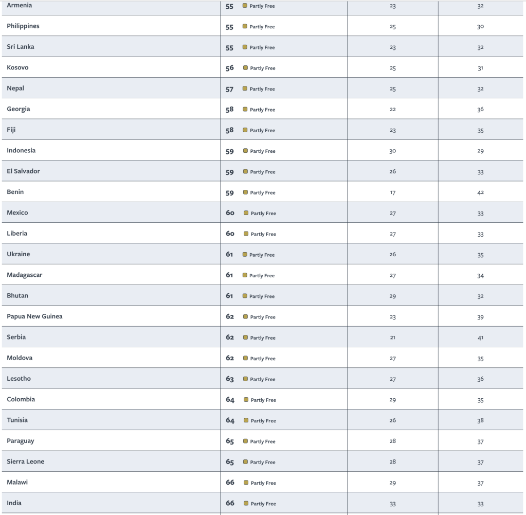 e nel riepilogo globale è indicata come “parzialmente libera” con un punteggio che l’equipara al Madagascar e al Buthan…