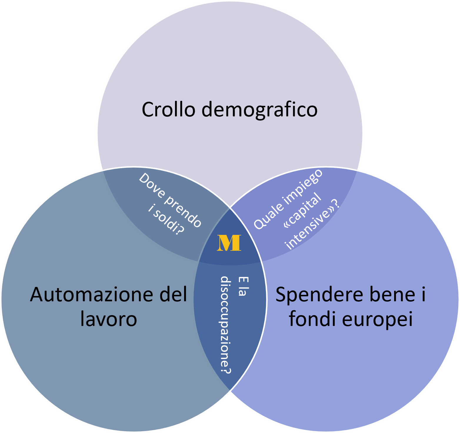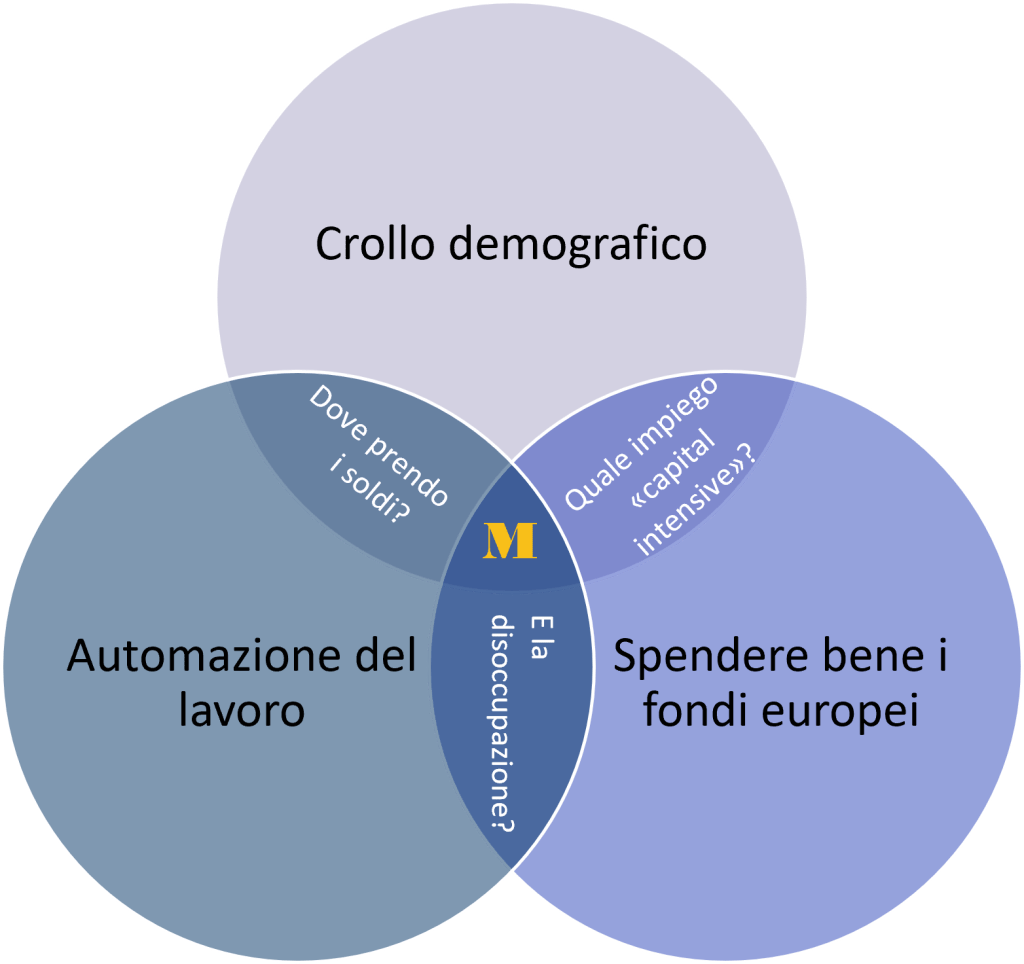Ma come fare per dare questo violento impulso all’innovazione in un paese come l’Italia, in cui le imprese sono restie o non hanno i capitali per investire? La risposta, ovviamente, è il PNRR. A suo tempo, in un articolo ben anteriore all’insediamento del governo Draghi, avevamo scritto che «esiste un solo modo buono di spendere i soldi del Recovery Fund, ed è investirli in grandi iniziative ad alto moltiplicatore». Ecco, quindi, la risposta: i soldi del PNRR devono essere spesi in larghissima parte per innovare tecnologicamente il paese, e in particolare per le infrastrutture digitali e per digitalizzare tutti i processi della P.A. In questo modo, si incontrerebbe l’esigenza di creare le condizioni per una massiccia automazione e quella di spendere i fondi del PNRR in poche iniziative ad alto valore aggiunto. Questa combinazione è raffigurata nel diagramma qui sotto, dove la M nell’intersezione dei tre problemi indica che lì si potrebbe compiere il Miracolo, grazie al quale ciascun problema sarebbe risolto dagli altri due.