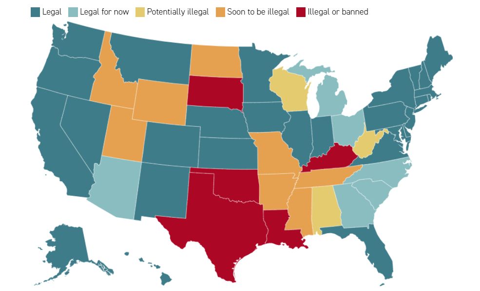 Quali effetti ha questa decisione? Almeno dal punto di vista di un europeo, un caos. Ogni Stato degli USA può ora avere una diversa normativa, e ci sono diversi Stati che avevano in realtà già approvato leggi restrittive dell’aborto che erano state bloccate perché incostituzionali secondo la precedente interpretazione. Queste leggi saranno quindi “sbloccate”, mentre in altri casi si tornerà alla legislazione precedente, e in altri ancora invece resteranno in vigore leggi favorevoli all’aborto già approvate e ovviamente ancora valide. Questa situazione è efficacemente rappresentata nella figura qui sotto, tratta da un utile articolo di Politico.com: