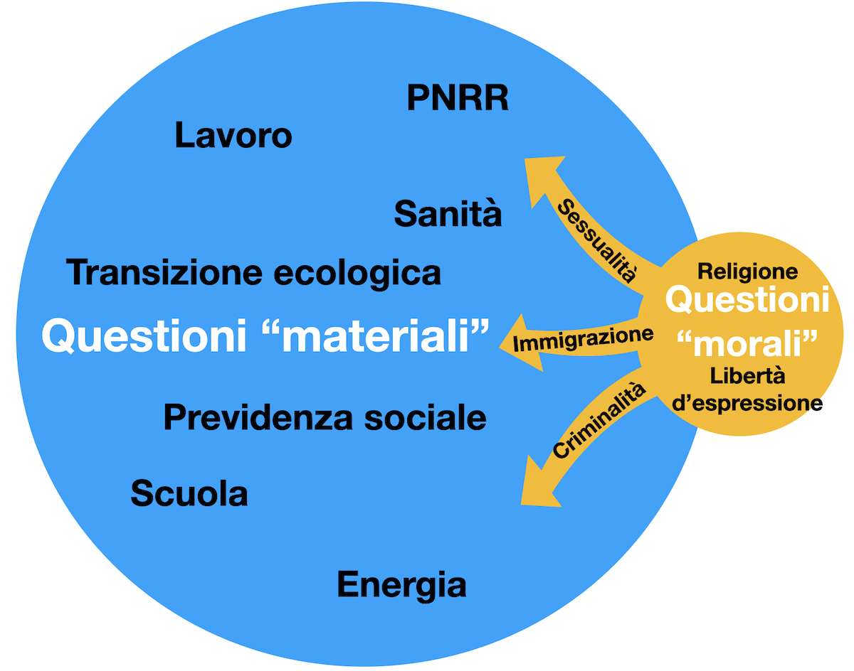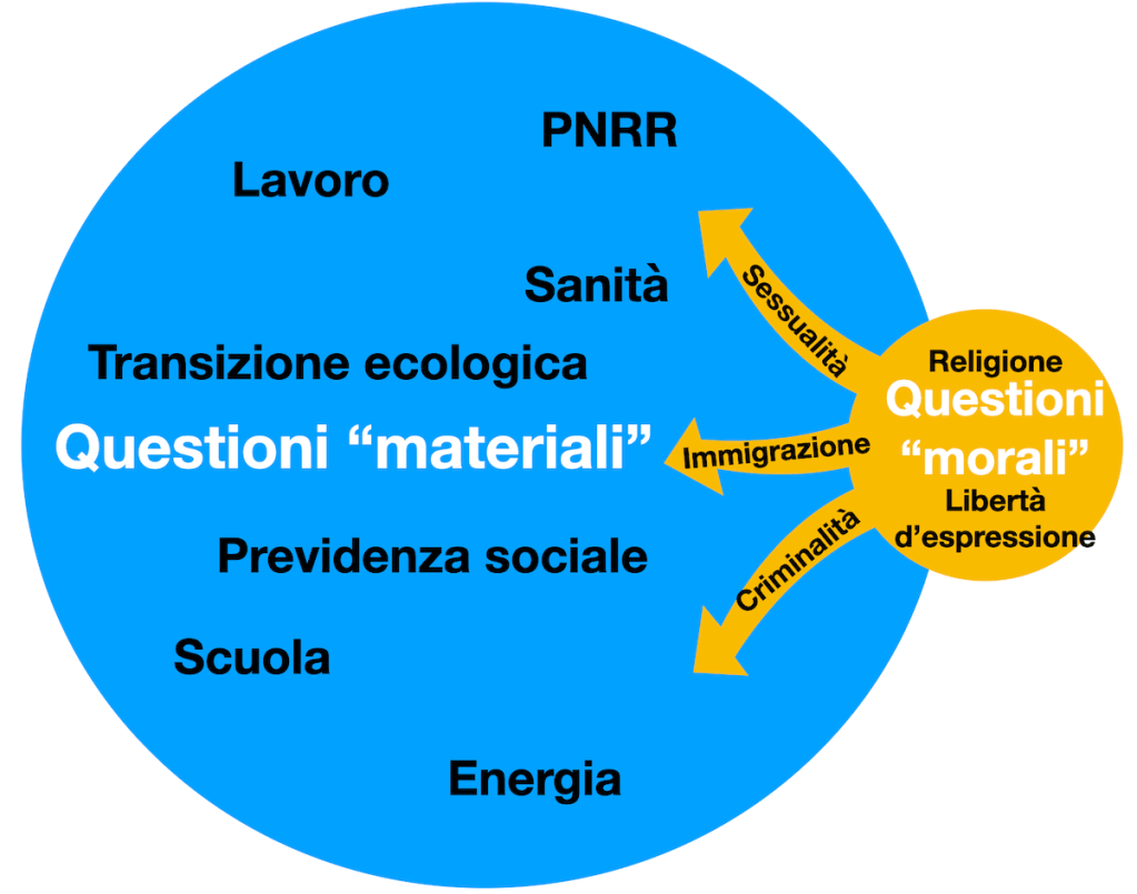 - le questioni materiali riguardano lo sviluppo e il benessere fisico, pratico, economico e sociale degli individui; ovviamente lo sviluppo industriale, l’agenda digitale, il mercato del lavoro, la sanità, eccetera; a occhio e croce si tratta del 90% delle questioni rilevanti di cui si deve occupare la politica;