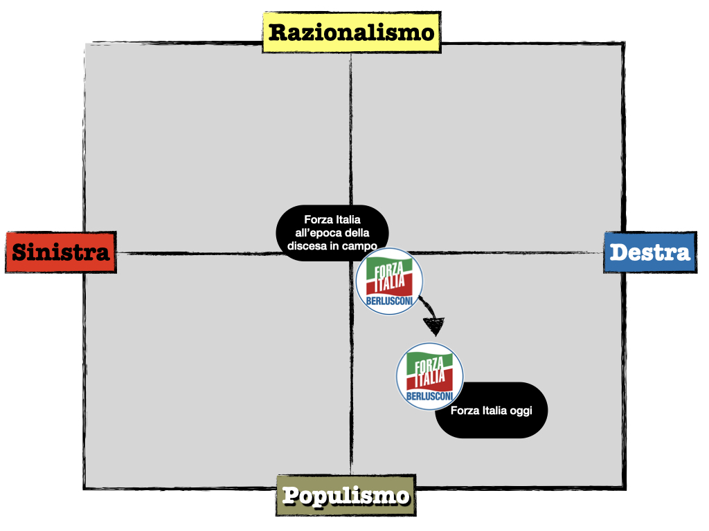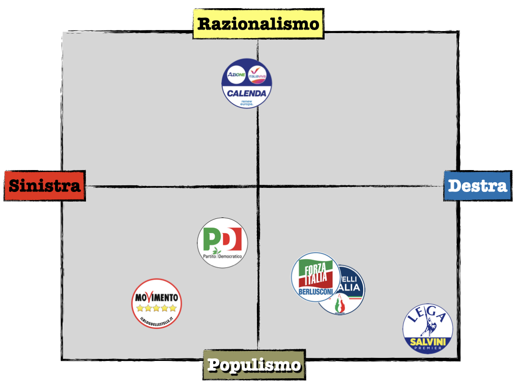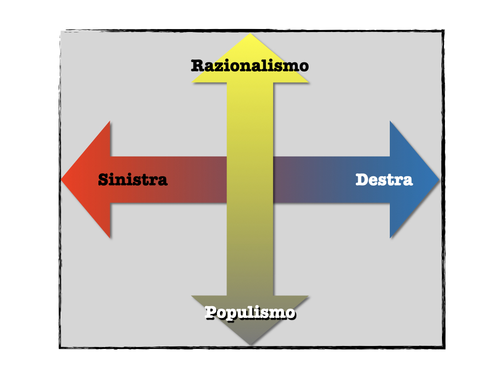 E adesso procediamo, con disegni esemplificativi da intendere, ovviamente, come rappresentazioni simboliche, espressive e, ovviamente, molto personali. È evidente che si tratta di mie opinioni, e non di “misurazioni” del populismo, del razionalismo, o del “destrismo” dei vari partiti.