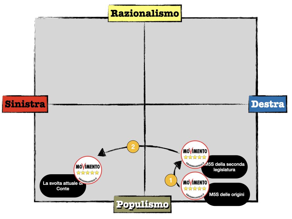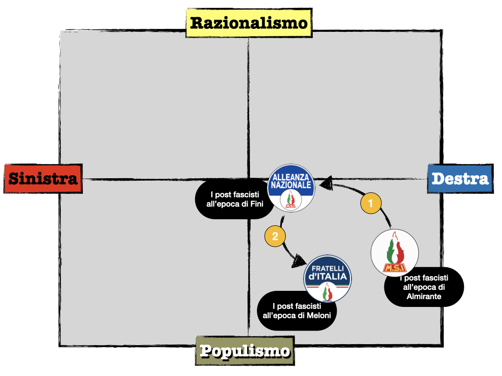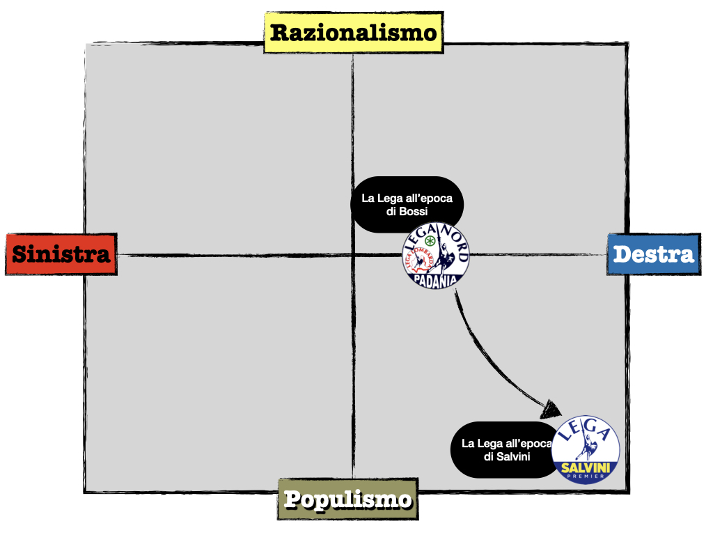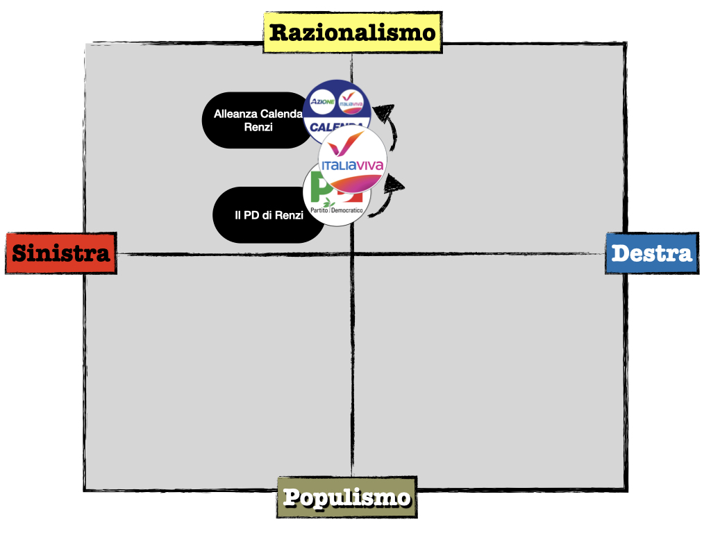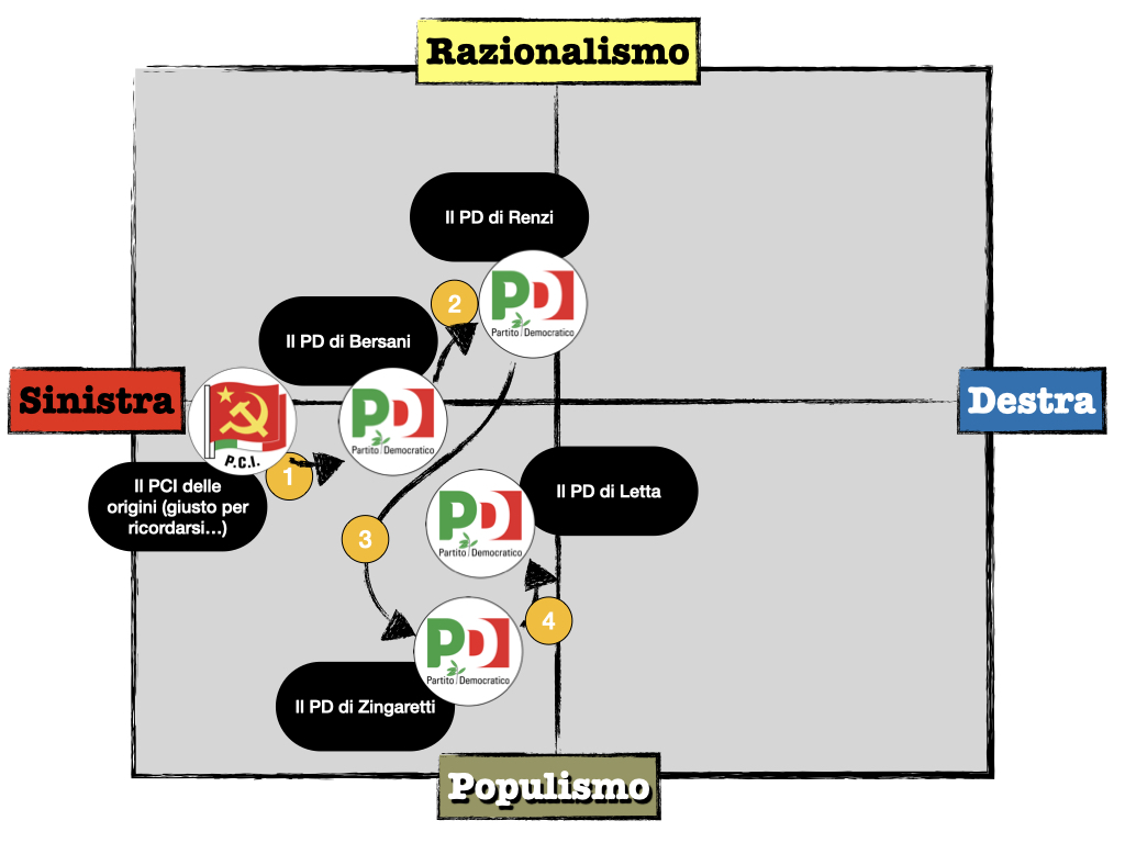 Per mostrare i percorsi dei principali partiti userò una matrice utilizzata da diverso tempo qui su HR, che riteniamo estremamente più efficace nel rappresentare lo spazio politico contemporaneo:
