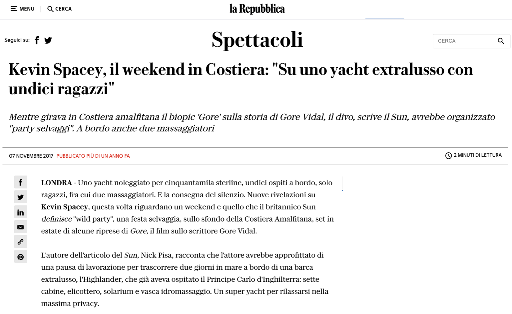 - Infine, i quotidiani di tutto il mondo sguazzarono in maniera ignobile sulla vita privata dell’attore; non so se ricordate i titoli del novembre 2017 relativi alla festa che Spacey tenne al largo di Napoli, su uno yacht. Vi riproduco solo quello di Repubblica, che si suppone essere un giornale mediamente serio (ne scrivemmo, a suo tempo, QUI).