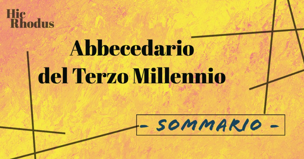 Per comodità dei lettori ripropongo qui tutti i link ai 40 lemmi, comunque rintracciabili cliccando sulla categoria “Abbecedario” (lato sinistro della pagina Hic Rhodus) o sulla tag #abbecedario.