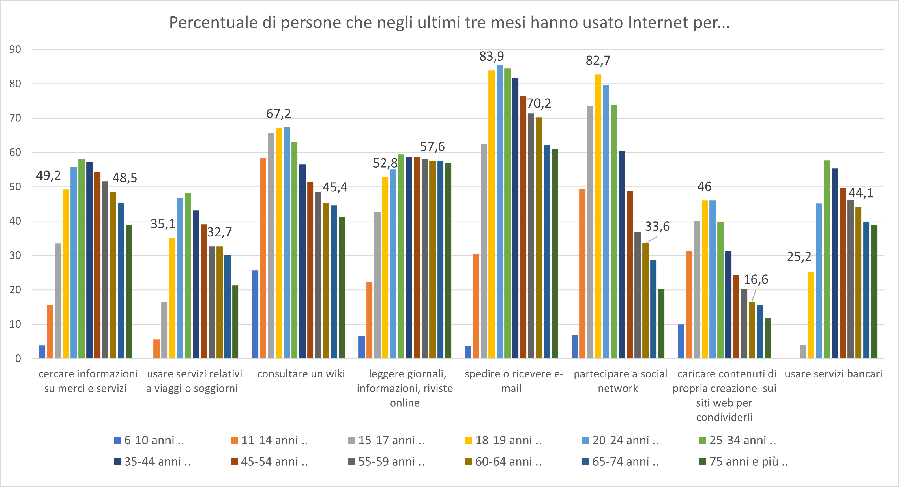 Come si vede dal grafico (specie se non siete boomer e avete ancora gli occhi buoni, altrimenti vi conviene cliccarci sopra per ingrandirlo), e come è abbastanza ovvio, la frequenza dei diversi utilizzi di Internet è molto variabile a seconda del tipo di utilizzo e della fascia di età. Per facilitare un po’ la lettura, nel grafico ho inserito i valori per le barre relative alla fascia 18-19 anni (quella dell’ultimo anno delle superiori) e 60-64 anni (i più “giovani” tra i destinatari del corso che ha ispirato questa riflessione); come si vede, tra quelli rappresentati (ne ho escluso qualcuno troppo “generazionale”, come giocare o cercare informazioni sanitarie) ci sono solo due impieghi di Internet per i quali c’è un abisso tra i ragazzi e gli “anziani”: l’uso dei Social e la pubblicazione di contenuti autoprodotti. In alcuni casi, anzi, i sessantenni non sembrano avere granché da imparare dai loro “nipotini”.