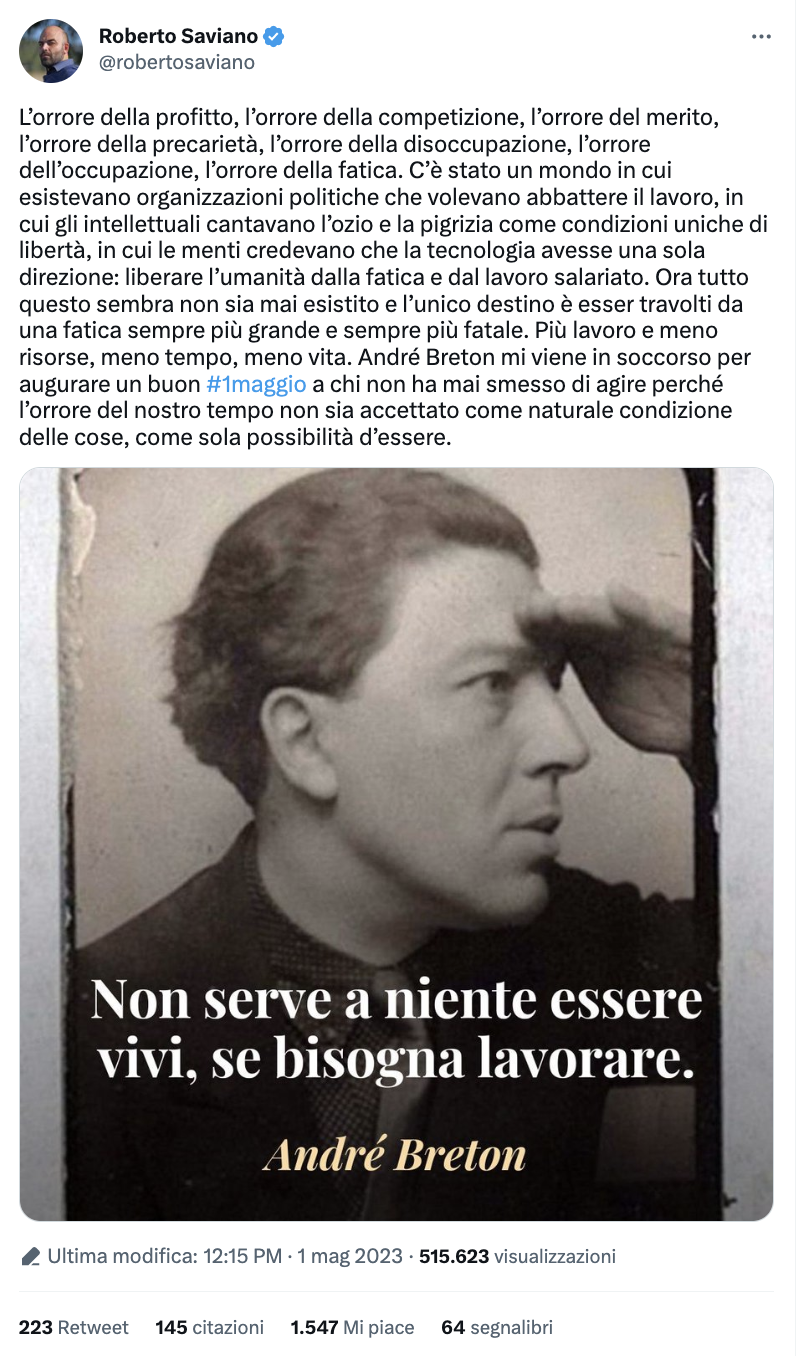 Il marcio danese riguarda l’uso mistificatorio dei dati; non a caso Stagnaro è un ingegnere, la forma mentis è quella: i dati, le cose, i fatti. E prendere l’età media della vita e la mortalità infantile viene facile, ma così facile! Peccato che non sia stato un argomento toccato da Saviano. Saviano, sia chiaro, si sbaglia di grosso quando dice “più lavoro” (le ore lavorative sono di molto diminuite), “meno tempo” (il tempo libero è specularmente aumentato) e “meno vita” (dove Saviano non intende – ovviamente – che si vive meno, ma che si vive male). E Breton a parte, che non c’azzecca nulla (il citazionismo è una deriva onanistica dei social media, Saviano può certamente farne a meno), le allusioni agli intellettuali che immaginavano un futuro liberato dal lavoro è solo una banale e mal compresa rimasticazione del giovane Marx. Roba buona per un tweet…