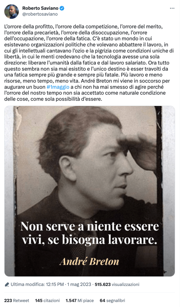 Allora: il 1° maggio Roberto Saviano se ne esce con questo tweet: