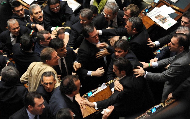 La bagarre. Termine giornalistico come ‘vacanzieri’, ‘torrida estate’ e altri cliché linguistici che entrano nell’uso comune; in questo caso un simpatico francesismo per dire rissa parlamentare, tafferuglio politico, lancio di crisantemi (contro Renzi), ingollamento di mortadella (contro Prodi), esposizione di volantini, manifesti, corde da impiccato… Perché nel Parlamento le chiacchiere a un certo punto finiscono e c’è bisogno di mostrare, esibire l’indignazione suprema, lo scandalo indicibile a cui si assiste, la mostruosità inenarrabile degli avversari. E giù un bel cazzotto se l’avversario è a tiro. E sia bagarre, quella vista alla Camera dopo l’annuncio della fiducia all’Italicum.