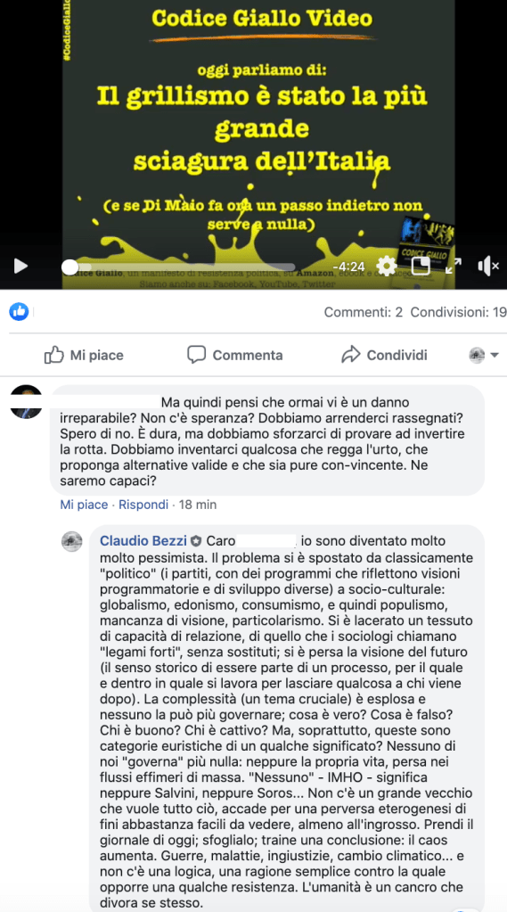Chiedo scusa se replico cose appena pubblicate altrove, ma siamo sommersi dai rifiuti e si deve riciclare il più possibile. La mia clip sulle dimissioni di Di Maio e la sciagura rappresentata dal grillismo la potete vedere QUI: https://www.youtube.com/watch?v=AjXM6xCMQxw&t=6s, mentre i due commenti sottostanti sono appena apparsi sulla pagina Facebook Codice Giallo il gruppo.