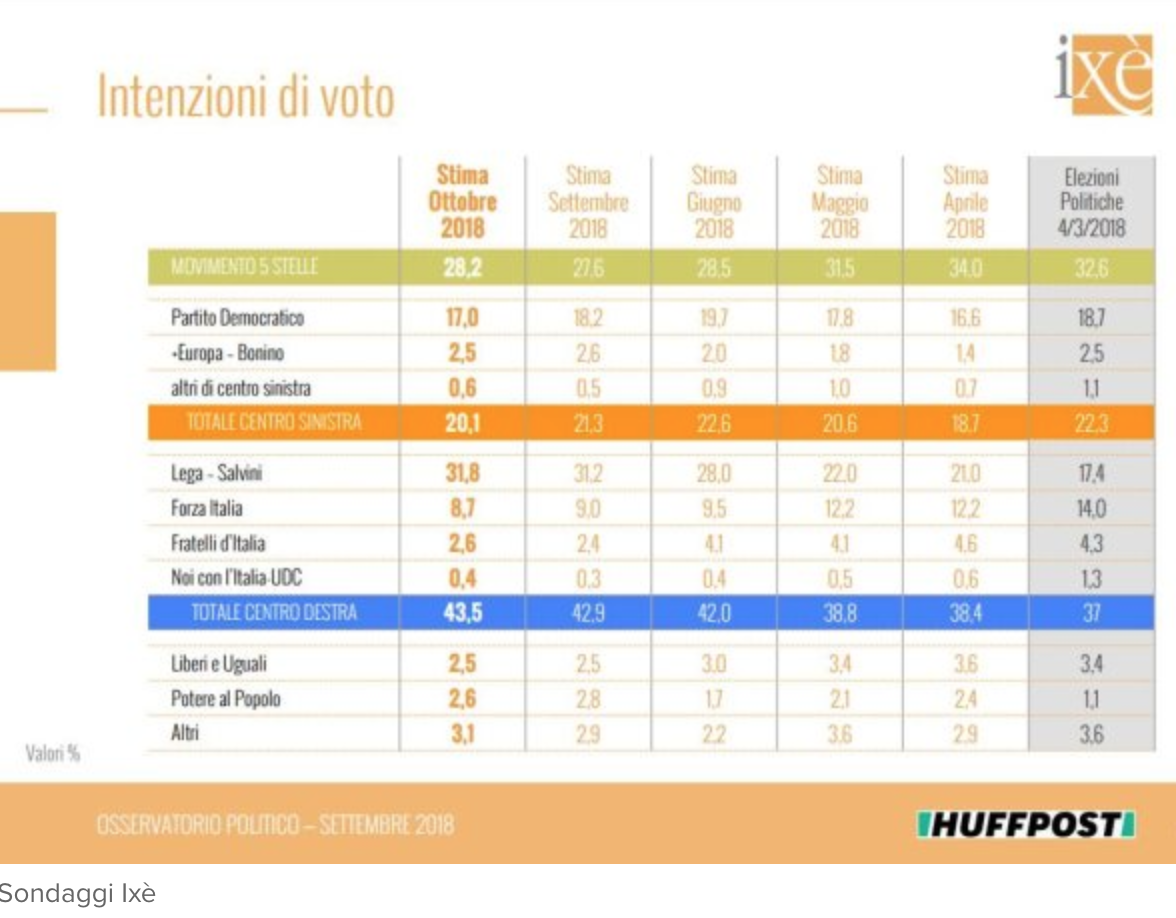 Con tutti i dubbi possibili sui sondaggi, che conosciamo e che abbiamo spiegato mille volte qui su Hic Rhodus, anche l’ultimo sondaggio mostra le forze di governo in crescita. E se anche il M5S, dal giorno delle elezioni, ha perso qualche punto (ampiamente compensato dal guadagno della Lega)